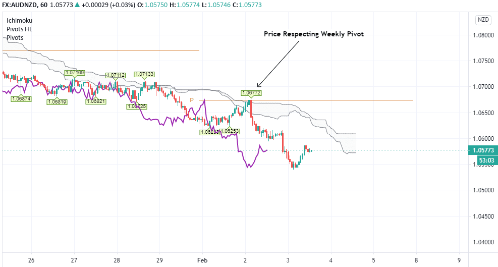 Overall, the longer-term outlook at this stage looks rather bleak for the Australian Dollar. Even shorter-term charts such as the hourly shown below, many indicators replicate the daily snapshot. Interestingly, the price has used the weekly pivot of 1.0673 as resistance, essentially rebounding from this level with pinpoint accuracy.