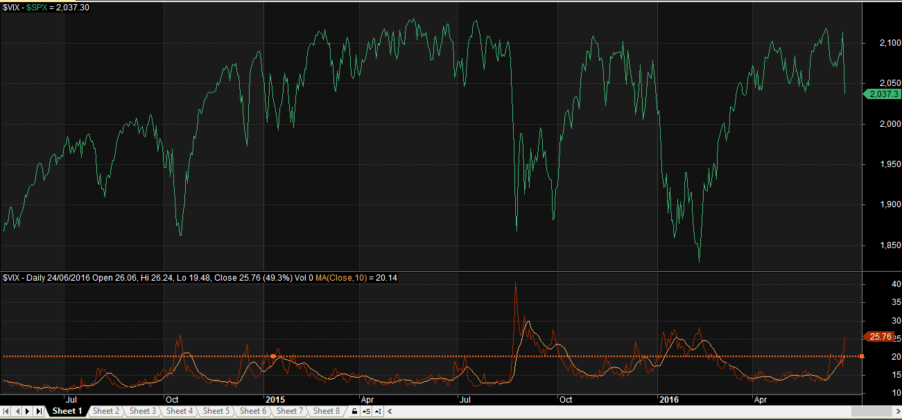 The green line in the chart below is the S&P500 and the red line is the VIX. As you can see, each time VIX has gone above 20, the S&P500 has seen some serious volatility over the following periods.